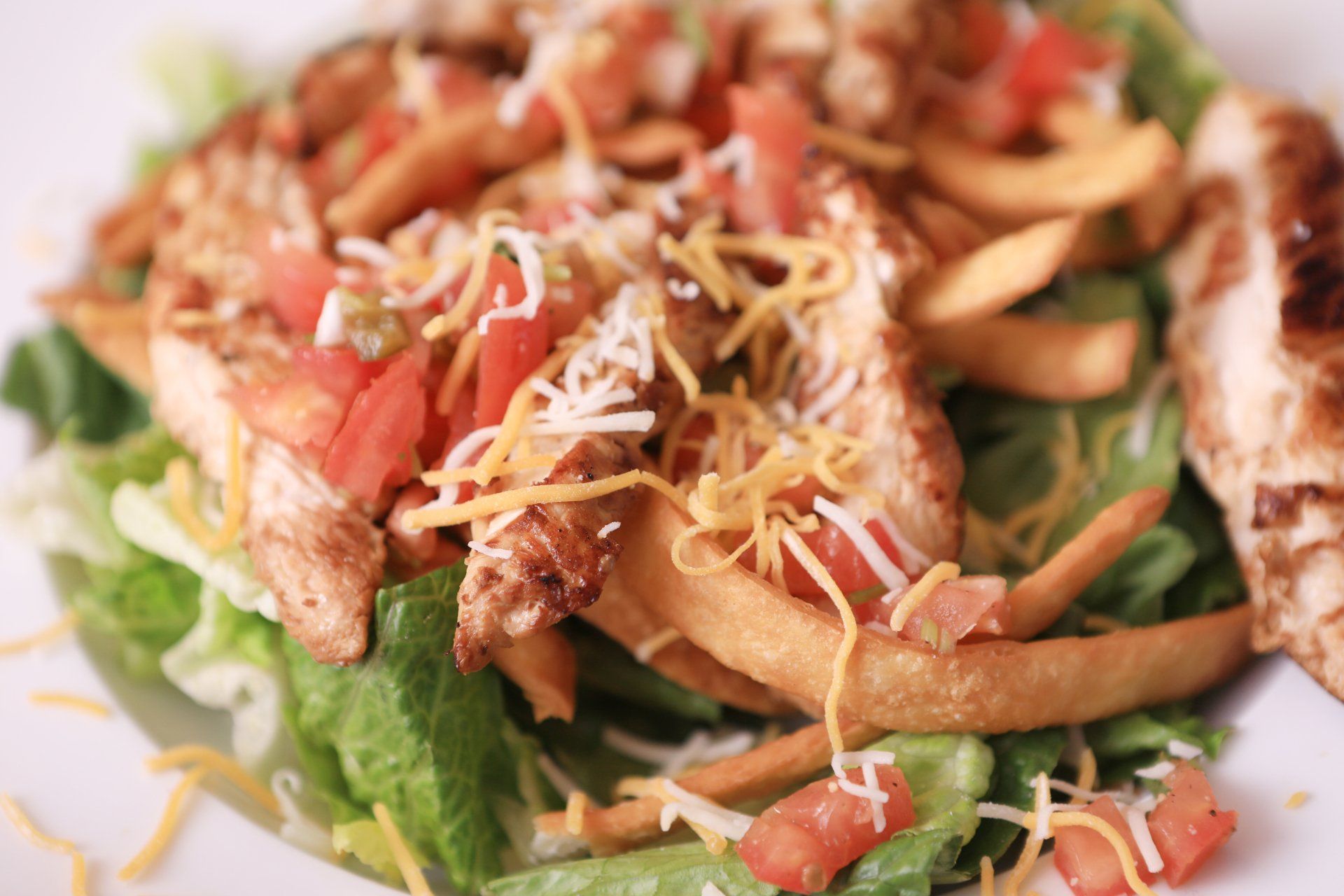 A marinated chicken breast is grilled and tapped with bacon, shredded cheese, Southwest dressing and pico de gallo.